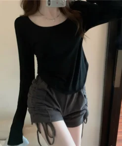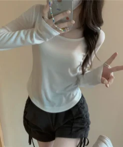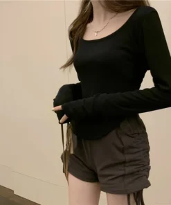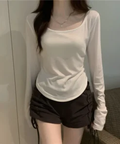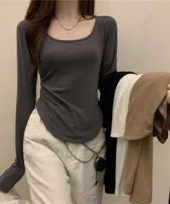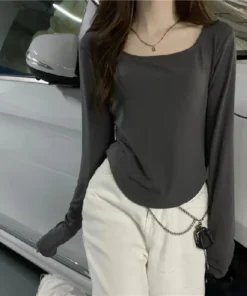 Square Neck Long Sleeve T-Shirt Women Spring Autumn New Irregular Hem Slim Casual Top Winter Solid Bottom Shirts New Korean