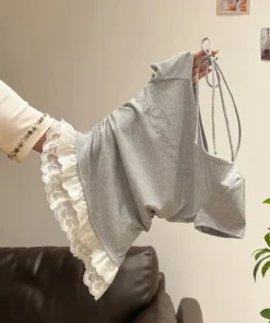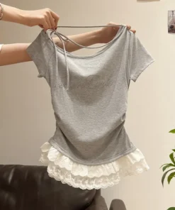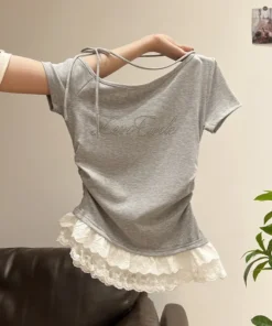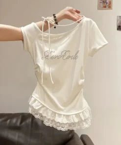 Summer Short Sleeve T-Shirt Women’s Pure Desire Slim Fit Lace Trim Shoulder Bared Side Collar Top Diamond Decoration Casual Wear