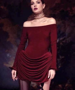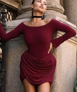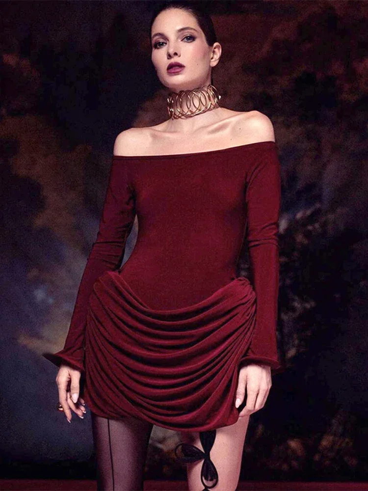 Trendix Pleated Bodycon Mini Dress Women’s Sexy Off Shoulder High Waist Long Sleeve Dresses Femme Party Elegant Burgundy Dress