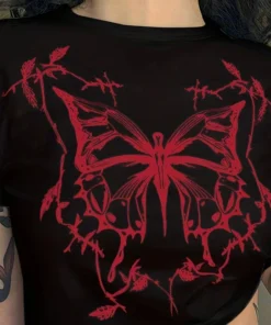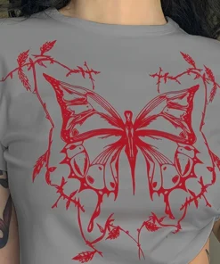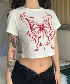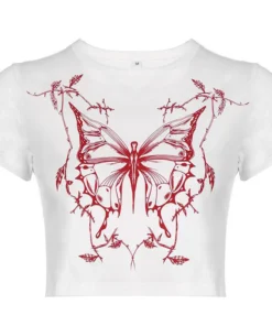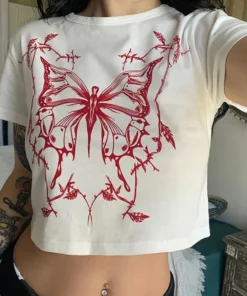 Vintage Fairy Grunge Butterfly Print Short Sleeve O-Neck Fitted Crop Top Punk Harajuku E-girl Tee American Y2K 90S Women T-shirt