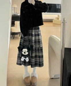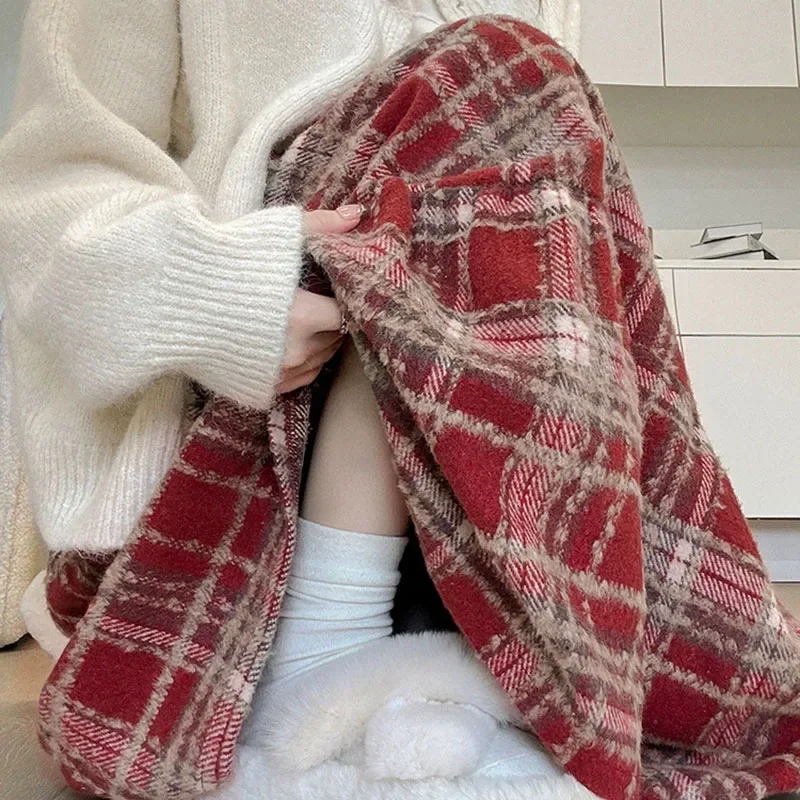Vintage Plaid Skirt for Women 2025 New Lazy Style Contrast Patchwork Pleated Skirts Lady Autumn Winter Woolen Long A-line Skirts