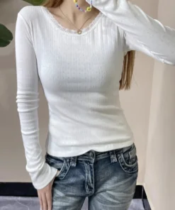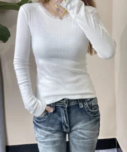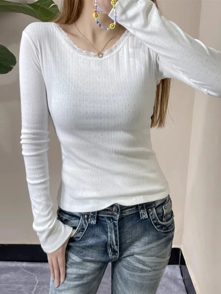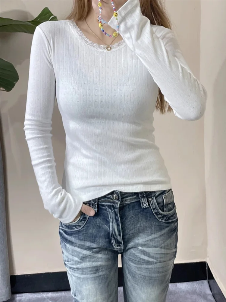 Vintage White Y2k Aesthetic Lace Patchwork O Neck Slim fit Long Sleeved T-shirt Women Sweet Top Basic Shirt