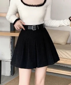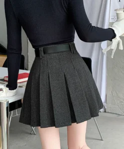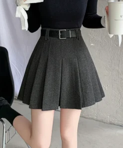 Vintage Winter Pleated Mini Skirt Women Streetwear High Waist Woolen Cute Skater Skirts With Shorts Belt Grey Black Skirt Woman