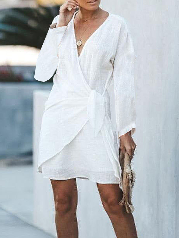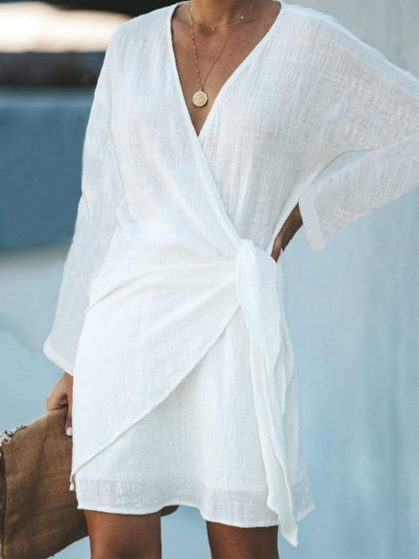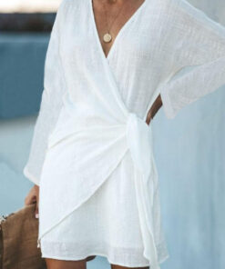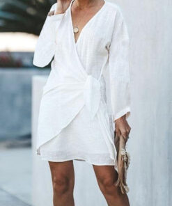 Refresh your summer beach wardrobe with this lightweight mini dress, and turn up the heat everywhere you go. The billowy long sleeves, tie side wrap, and short dress length give this elegant yet sultry dress the perfect balance of coverage and style. Finish your look with jewelry, flats/heels, and a clutch. Machine wash normal with light colors or hand wash. Bleach if needed. May be hung up to dry or lay flat. Tumble dry with low heat. Light ironing if needed.