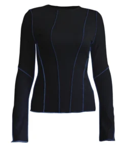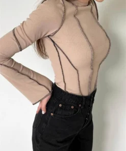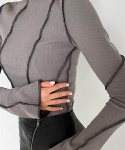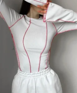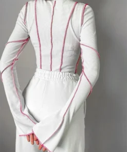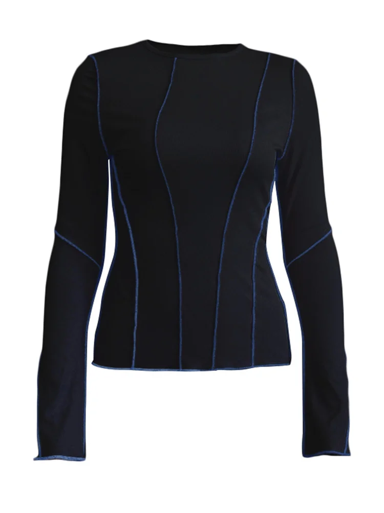 Women Patchwork T-Shirts Chic Casual Long Flare Sleeve Round Neck Knitted Ribbed Tees Shirts Spring Autumn Street Top