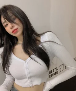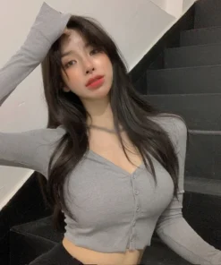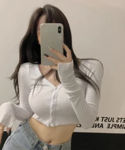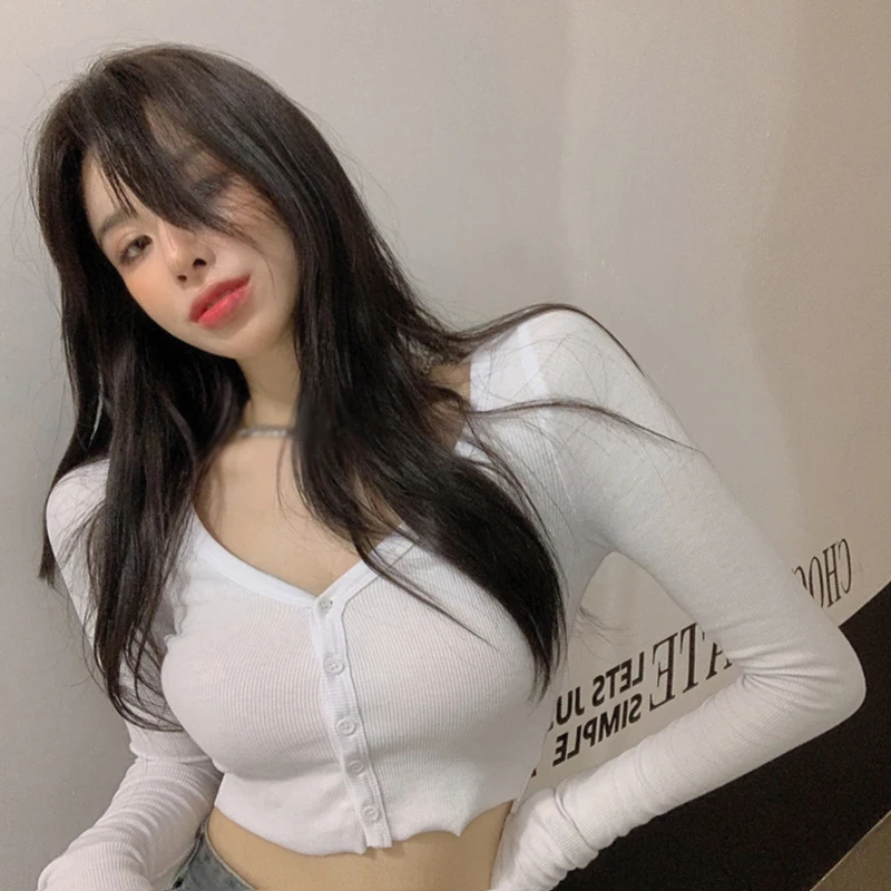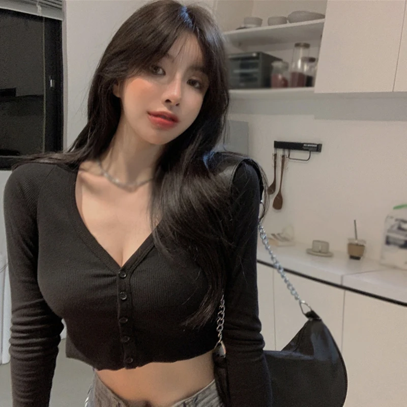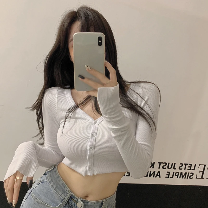 Women T-Shirts Long Sleeve Stretchy V-Neck All-Match Ladies Crop Tops Streetwear Korean Style