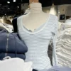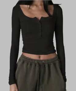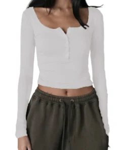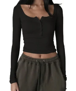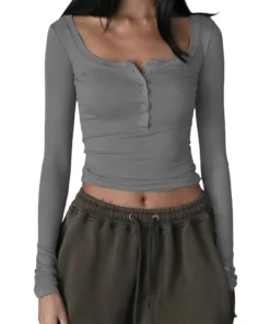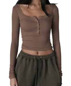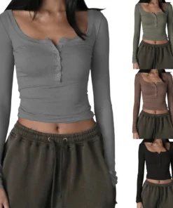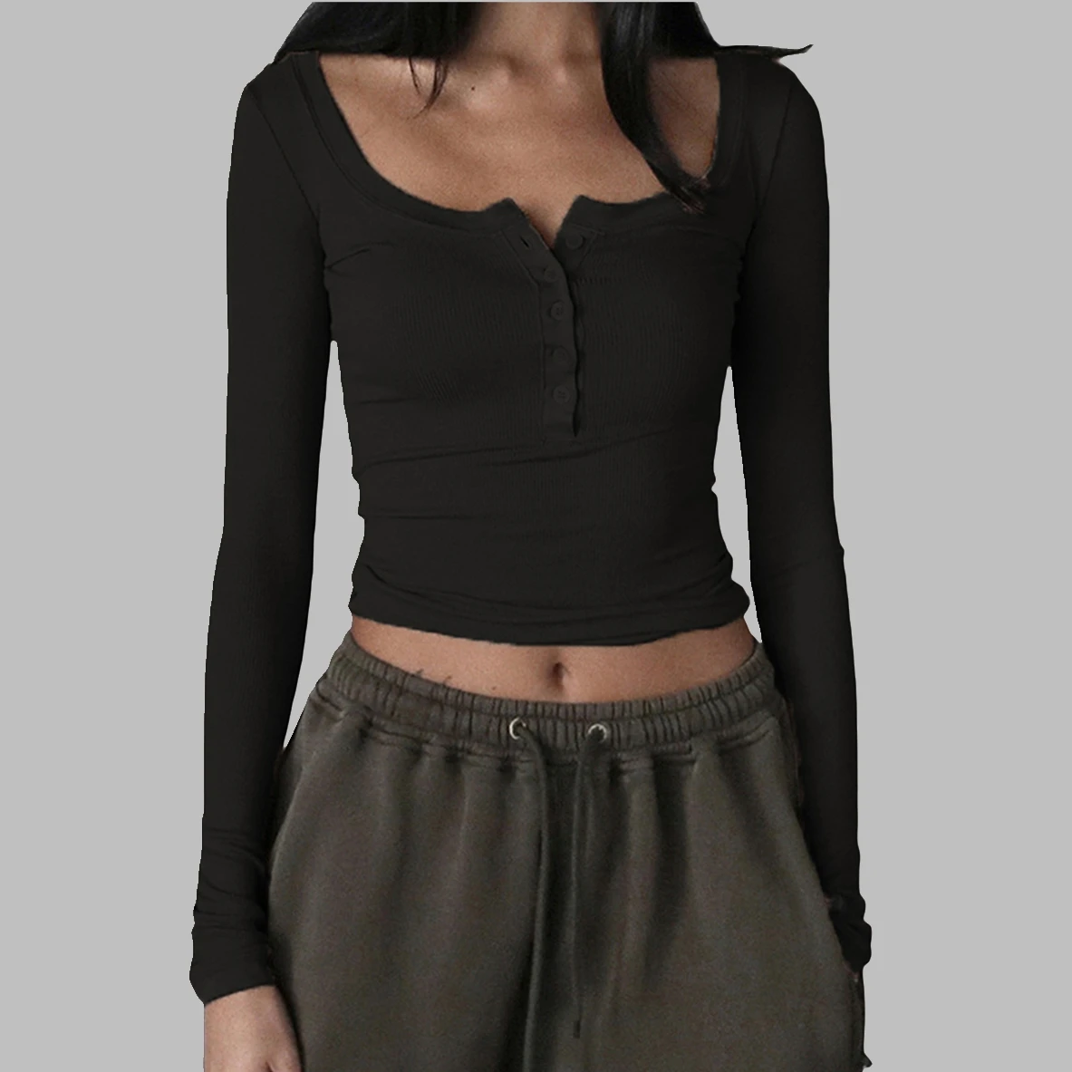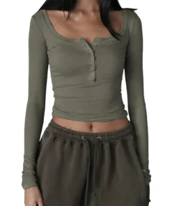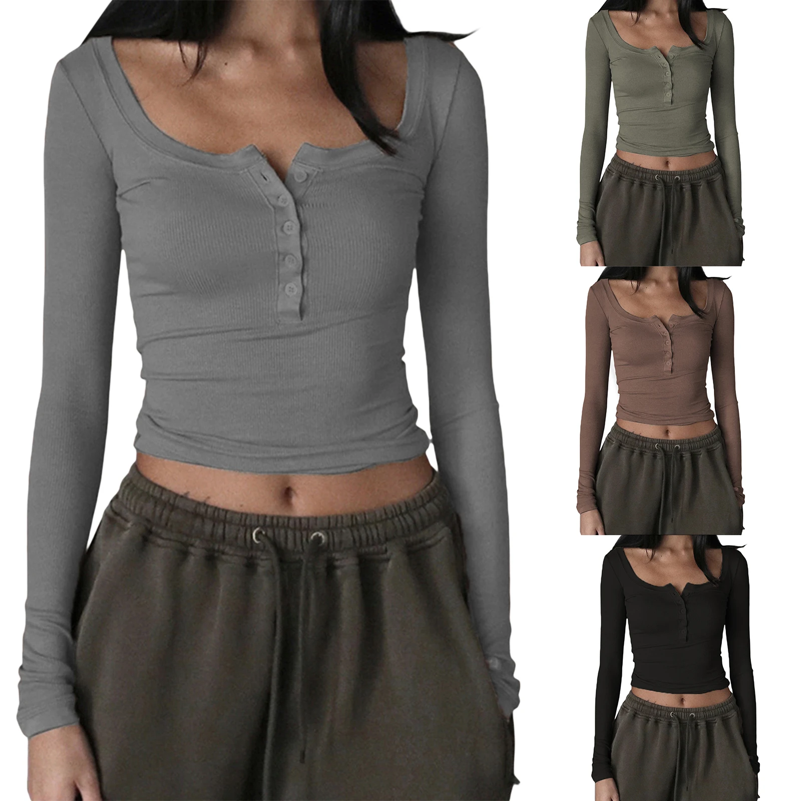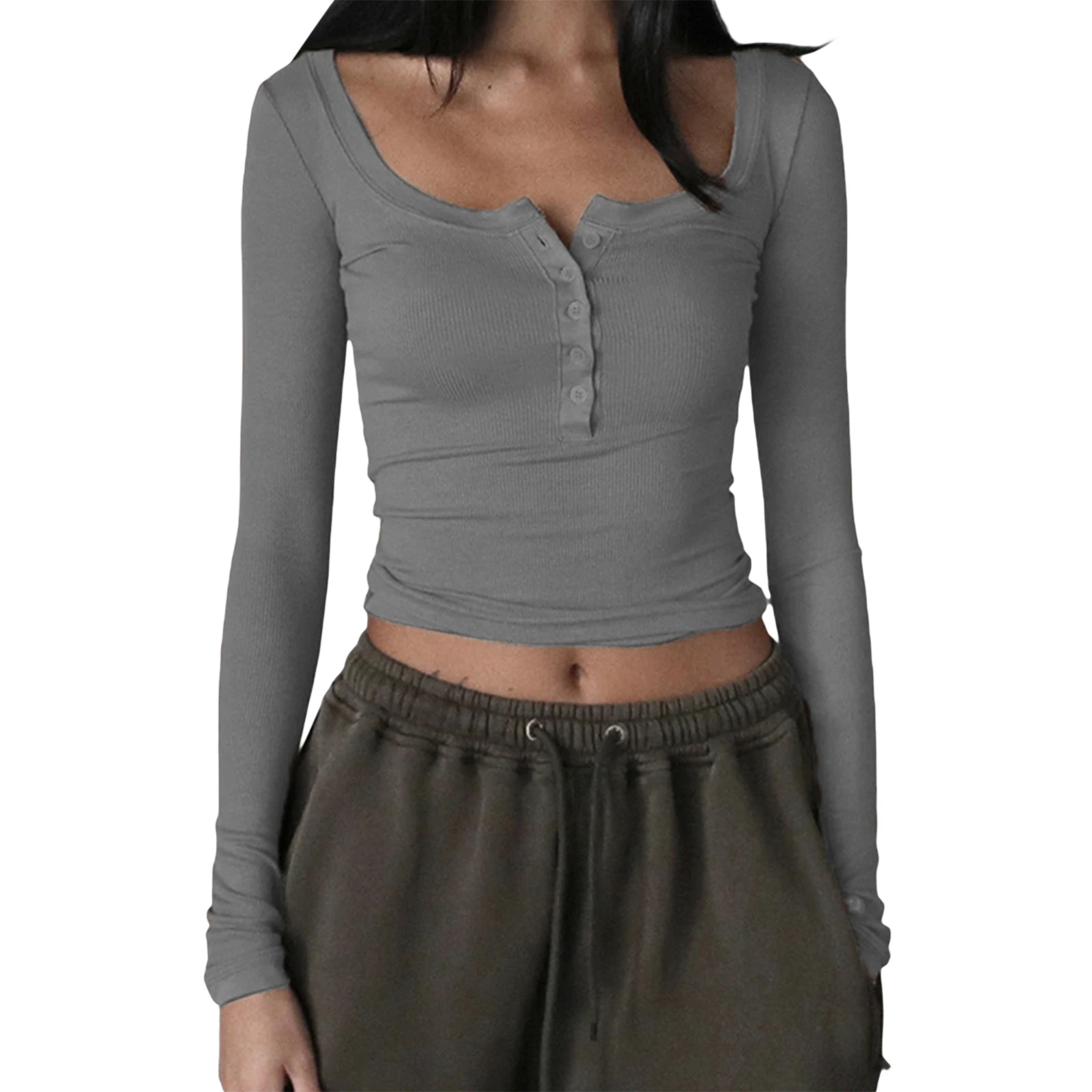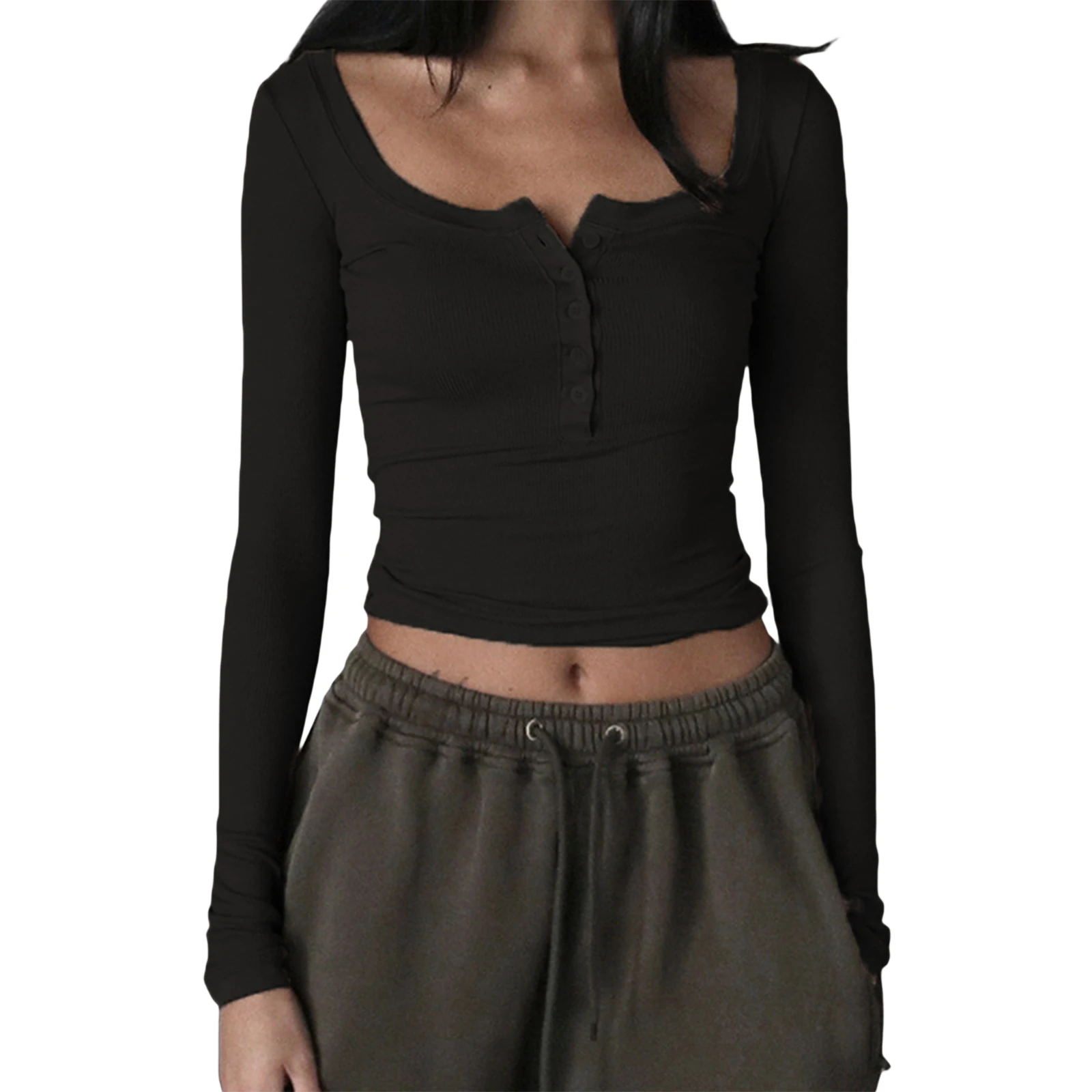 Women’s Knitted Henley Shirt Casual Solid Color Retro 1/2 Button Long Sleeve Crop Tops Streetwear Clubwear