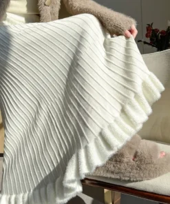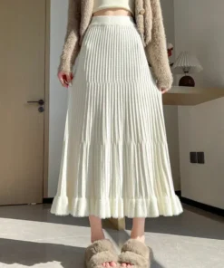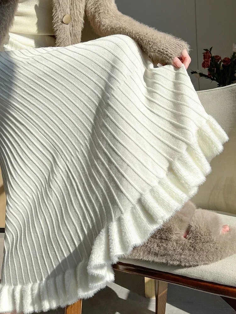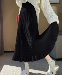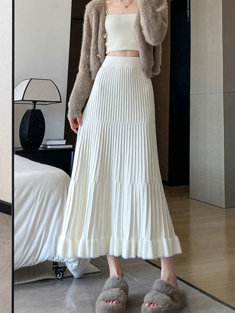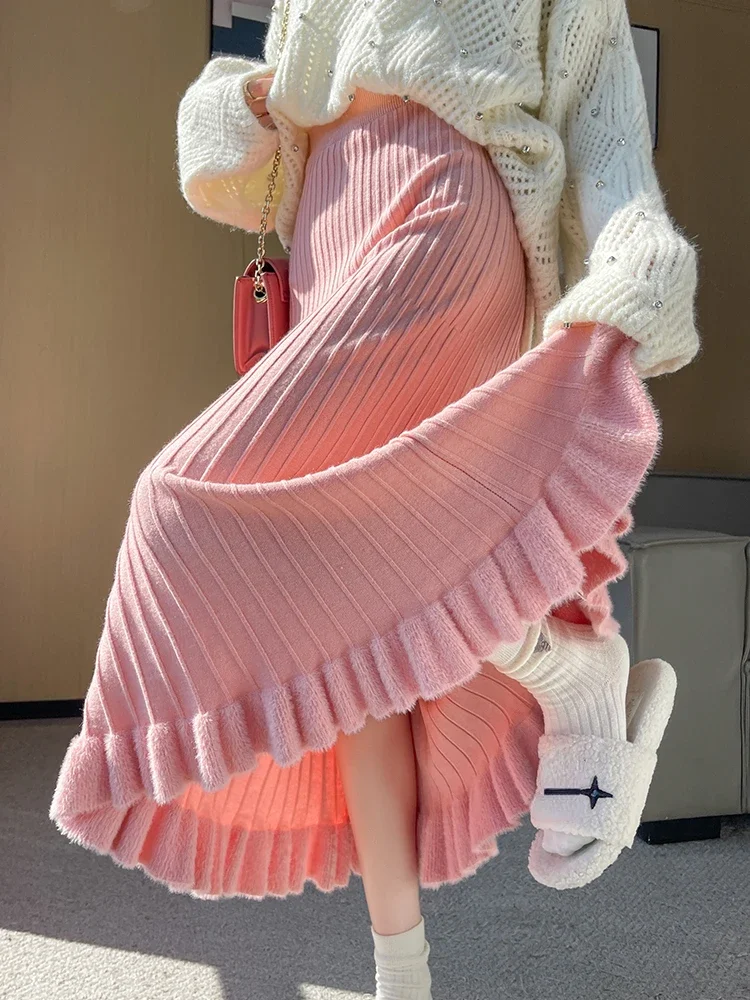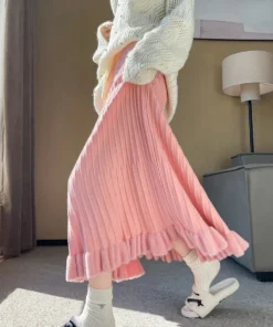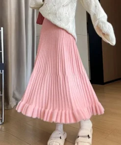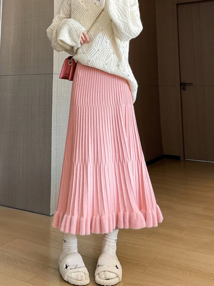 Women’s Pink High-Waisted Knitted Skirt Solid Color A-Line Mid-Length Pleated Fashion Autumn Winter New 2025