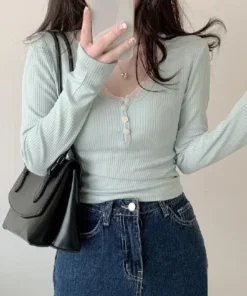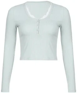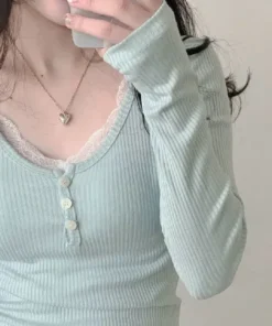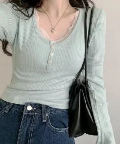 Women’s T Shirts Long Sleeve Slim Lace Button Kawaii Tshirts Female Y2k Tops Casual Tees Pulovers 2024 Spring New Woman Clothin