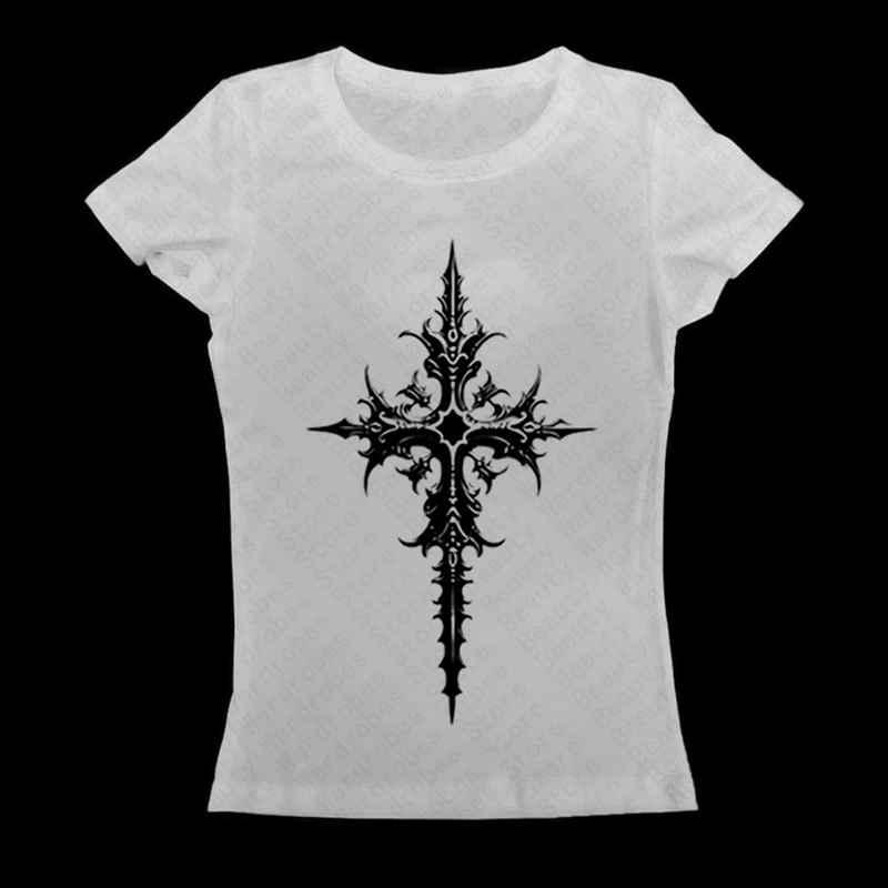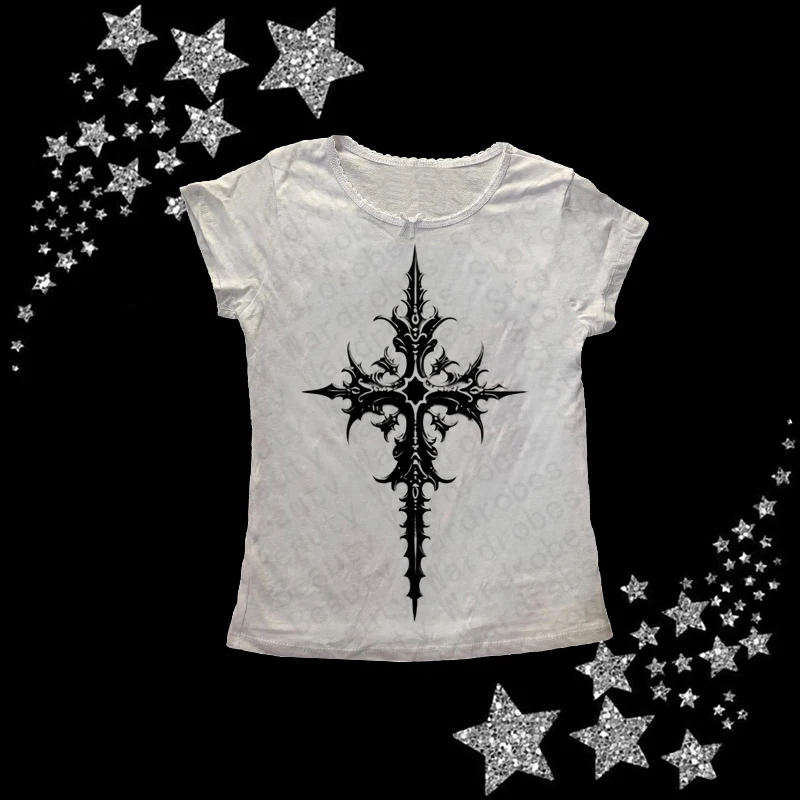 y2k Aesthetic Retro Graphic Crop Top White Short Sleeve O Neck Casual T Shirt for Women Vintage Basic Tees Ladies Clothes