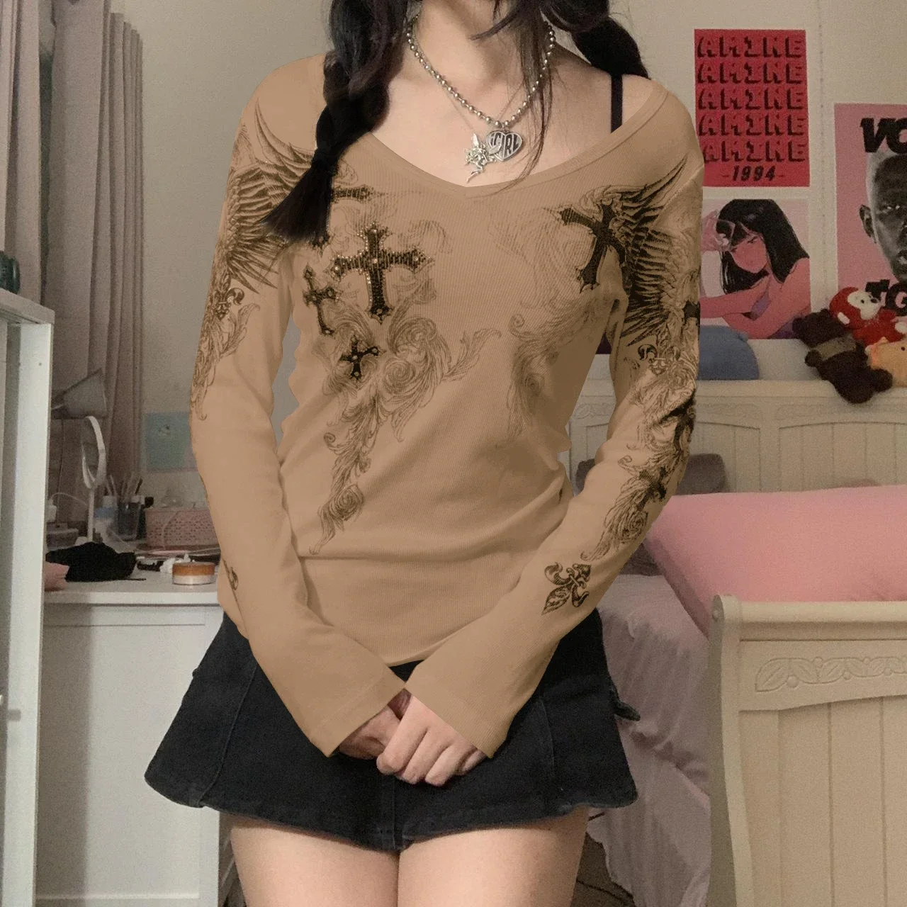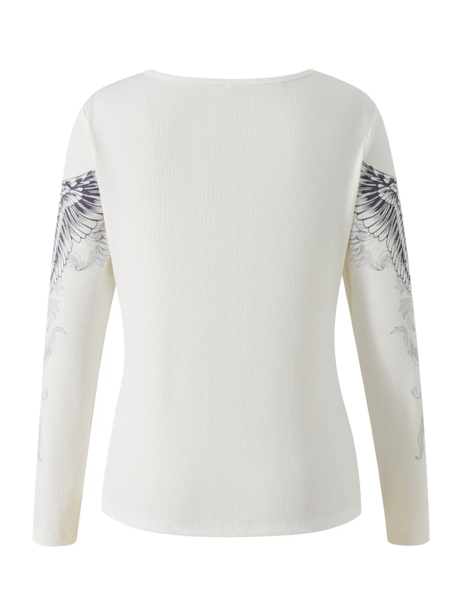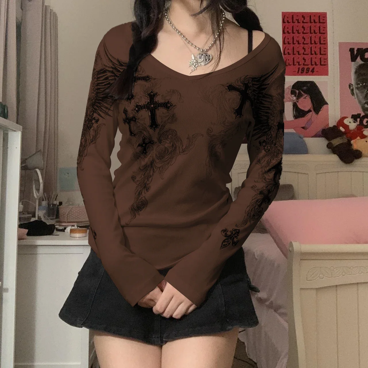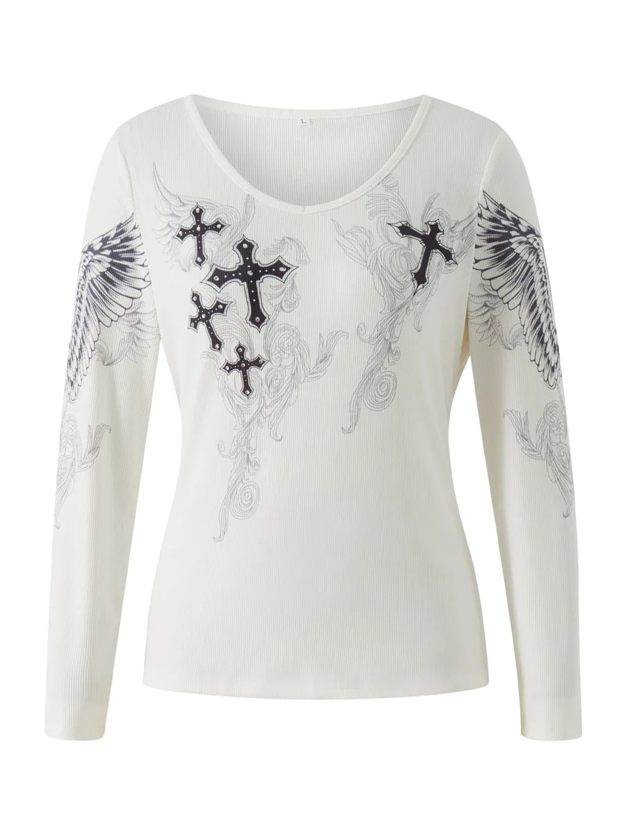 Y2k Graphic Cross Wings Print Long Sleeve Women Grunge Fairy T-shirt Harajuku Tee 2000s Aesthetic Punk Style Clothes Streetwear