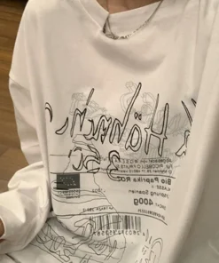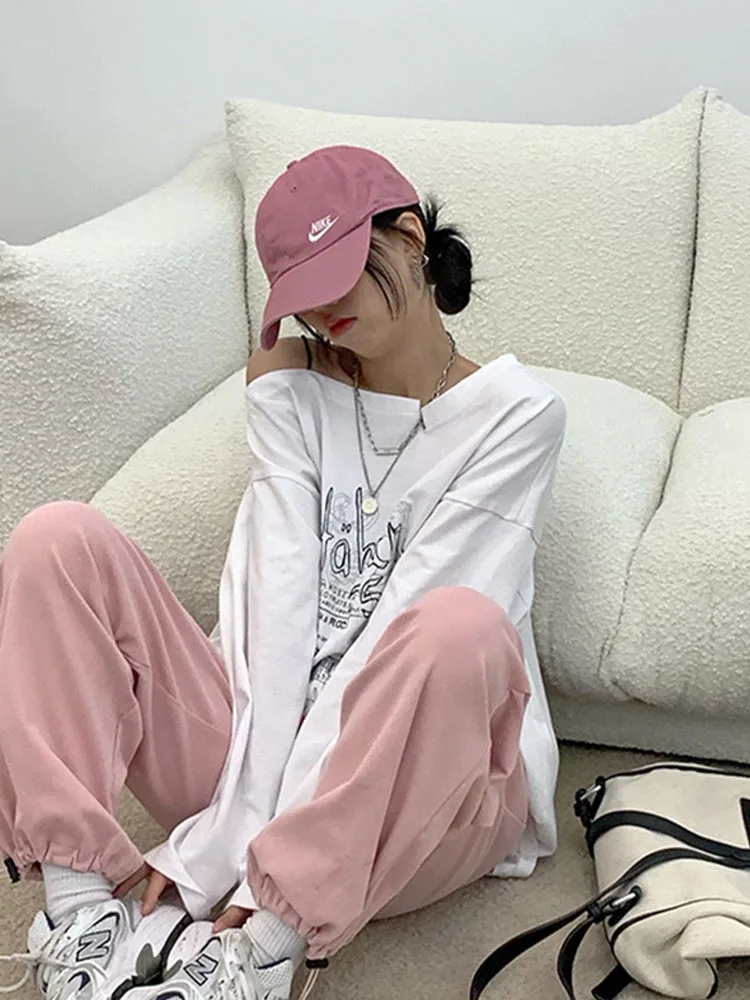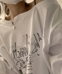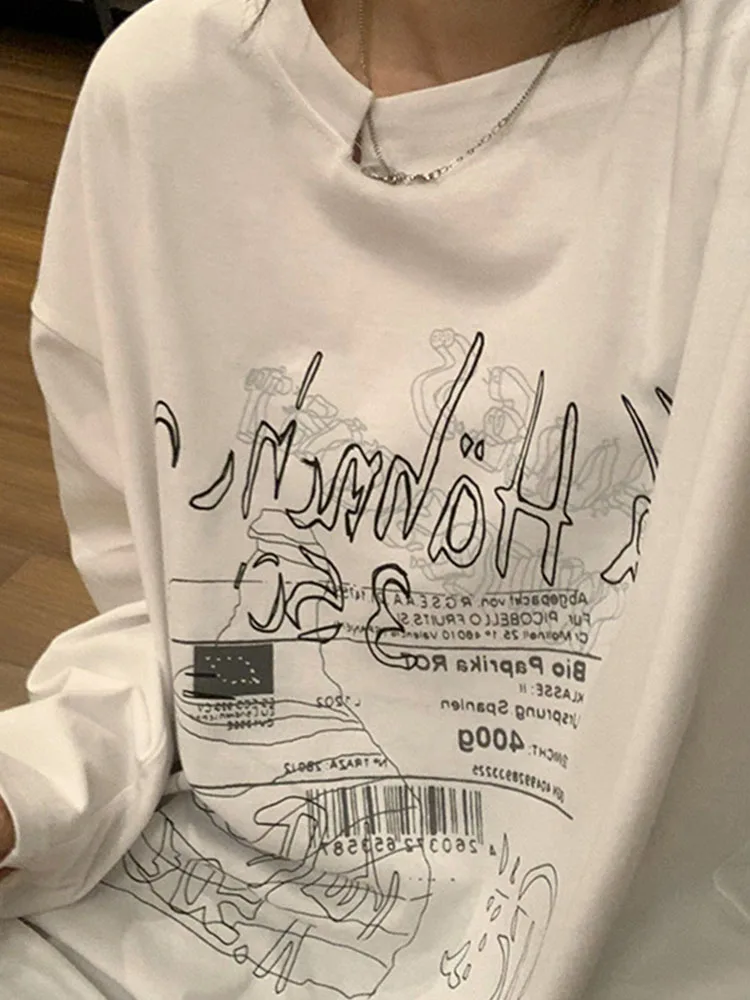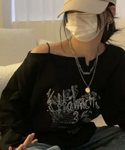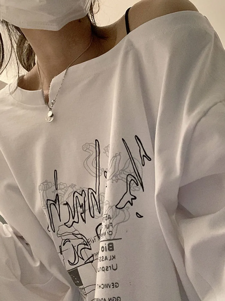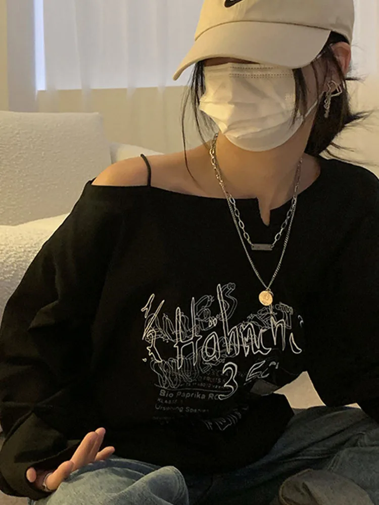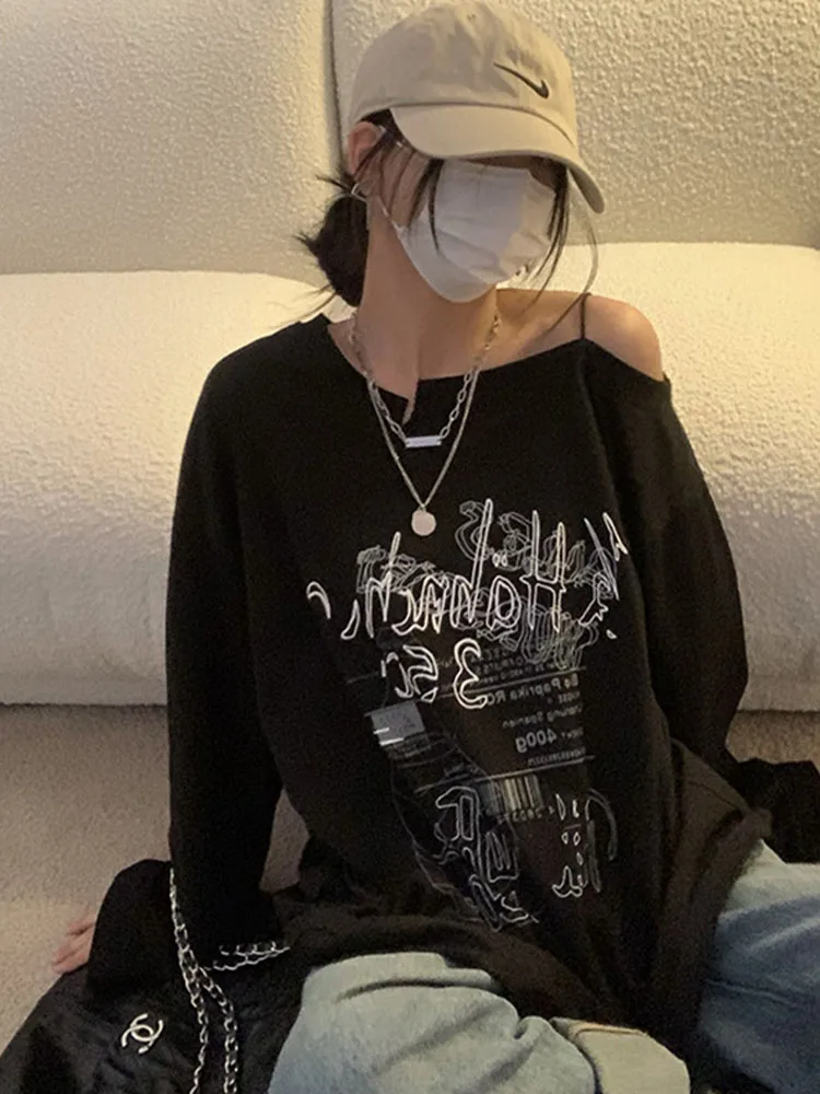 Y2K T-shirt Fairy Grunge 2024 Vintage Letter Print Tops Black Autumn Off Shoulder Long Sleeved Korean Tees Loose Harajuku Shirt